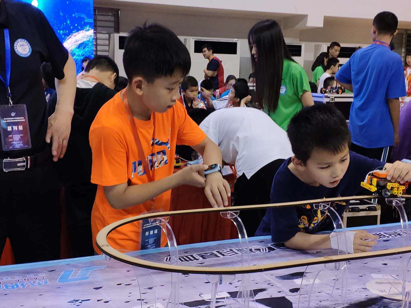 5月25日,由湖北省教育信息化发展中心(湖北省电化教育馆)、湖北省教育基金会主办的“2019年湖北省中小学电脑制作活动选拔赛”在武汉东湖学院隆重开幕。 湖北省教育厅黄国斌副厅长、武汉东湖学院党委书记湛俊三、湖北省教育厅基础教育处处长王洪波、湖北省教育厅科技处处长王强、湖北省教育基金会秘书长王建农出席活动。湖北省教育信息化发展中心主任、湖北省电化教育馆馆长邹德智主持开幕式。 本次竞赛旨在丰富学习生活,激发创新精神,培养实践能力,培养有国际竞争力的创新人才。竞赛分为机器人类竞赛和创客类竞赛,共13个项目,参赛选手达2500人。 赛场上,由透明材质架起的不足2CM宽的“赛道”,从远看仿佛是悬浮在空中,这个“空中赛道”正是“AI智能机器人运动会”中“平衡木”项目的比赛场地。 (“悬浮”在空中的“赛道”) “AI智能机器人运动会”的“主角”是美科的智能机器人。参赛选手若想要智能机器人顺利完成“平衡木”的比赛,首先需要设计合理的结构,确保其可以在赛道上保持平衡。同时,为了防止智能机器人在行进中从狭窄的“平衡木”上掉下来,同学们还要通过各种程序编写来控制智能机器人找准路线;在过弯道的时候调整转向轮差;行进中自主矫正平衡等。 (美科智能机器人排队“称体重”) (参赛的同学们) 为了适应不同年龄段的需求,“AI智能机器人运动会”将参赛者分成小学组、初中组以及高中组,组别不同,比赛的难度也有所不同。对于难度的区分,“AI智能机器人运动会”也有一个十分巧妙的方法,那就是增加弯道。千万别小看这些弯道,对于参赛选手们来说,每一个弯道都是对程序的一次重大考验。唯有通过不断的迭代、完善程序才能让智能机器人既迅速又完美的走完全程。 (小、初、高三个组别的“平衡木”) 看到同学们脸上认真的表情,比赛的难度可想而知。全场比赛最让M感到惊讶的是,小学组同学们对比赛的投入毫不亚于初高中的哥哥姐姐们。他们并没有因为年龄小而表现得扭捏,反而是放开手脚,全身心投入比赛之中。在赛场上,M还发现了一位来自华中科技大学同济附属小学的小选手,他沉着认真的样子仿佛全然忽略了今天是带病参赛,为他的竞赛精神点赞! (带病参赛的小选手) 不知不觉,“AI智能机器人运动会”与美科智能机器人陪伴同学们度过了一段快乐的时光。希望“AI智能机器人运动会”为同学们带来了更多新创意、新想法,也希望通过本次比赛,同学们的编程能力得到了充分锻炼。 M期待着“AI智能机器人运动会”加入更多赛事,为参赛者提供更多更有趣的AI智能赛项,让更多学生感受到人工智能的乐趣,提升编程能力,在科技创新的道路上越走越远。